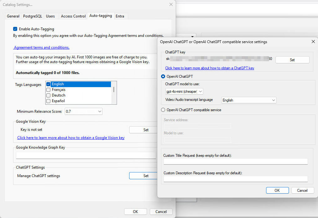 exterminador Posted 15 hours ago Report Share Posted 15 hours ago Hi there! Giving a try to the AI Auto-tagging feature but I cannot seem to get any tagging 😞 I've enabled it here:  And selected AI Tagging over a couple of images, the first time I received a message saying something about the file being added to a queue. The popup window required to check the "don't show again" option to be able to close it so I checked it and don't see it anymore. Do you know where to view that queue to see if something is getting stuck? The key I created in openai.com looks like this:  Am I probably missing something I should enable? BTW, not using the Faces recognition feature yet so I do not have it installed. Thanks for any ideas!  Quote Link to comment Share on other sites More sharing options...